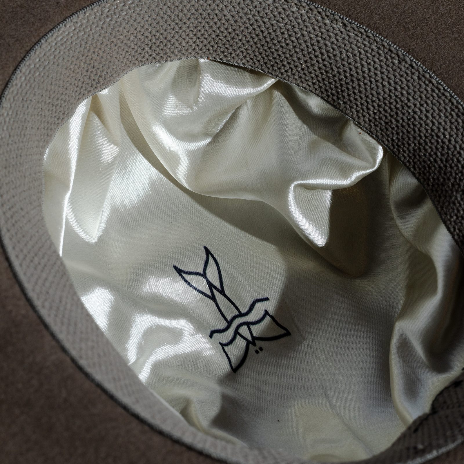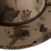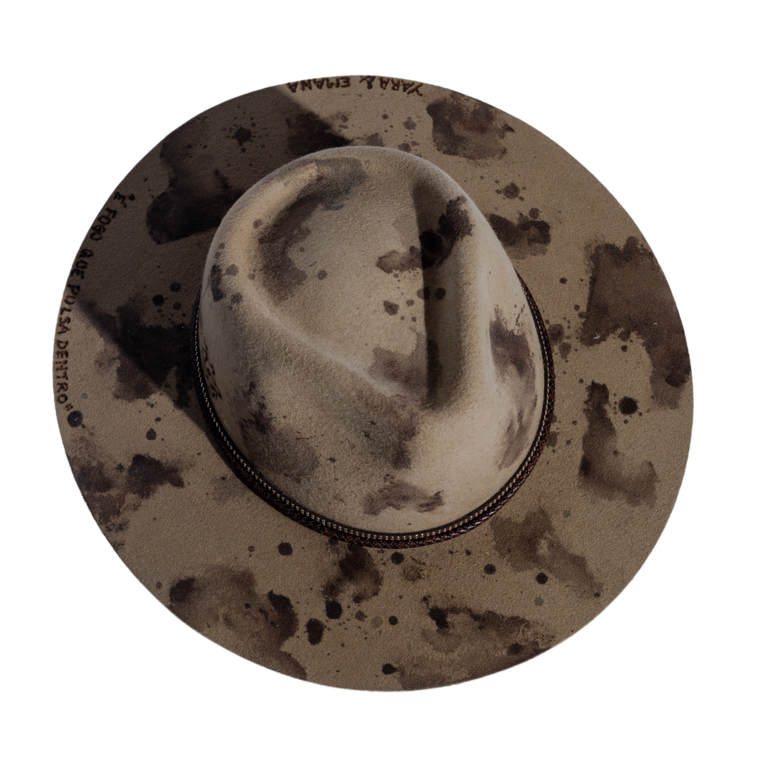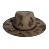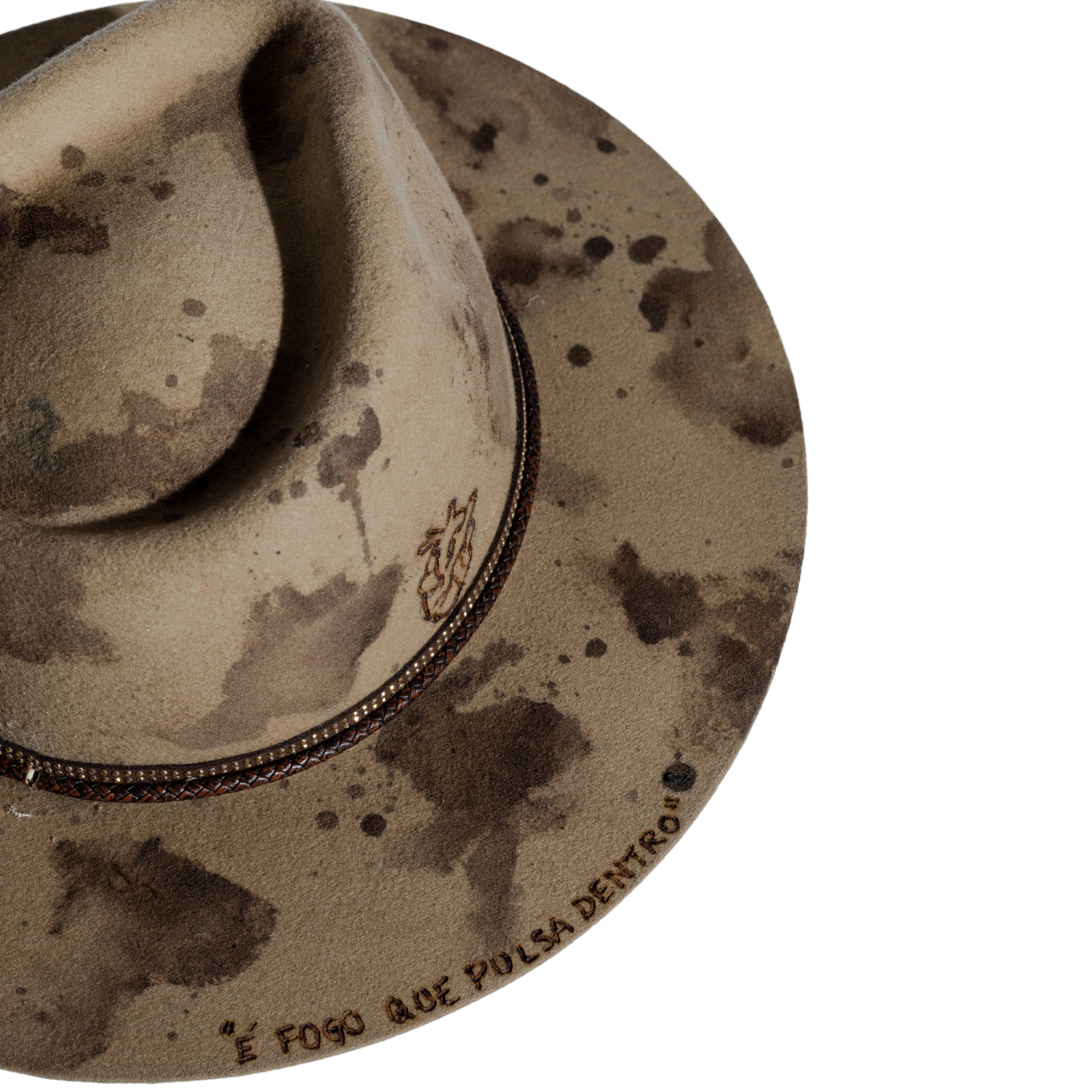 • Chapéu fedora em lã camelo com pintura em aquarela no estilo boho country, evocando paisagens calmas e terrosas.
