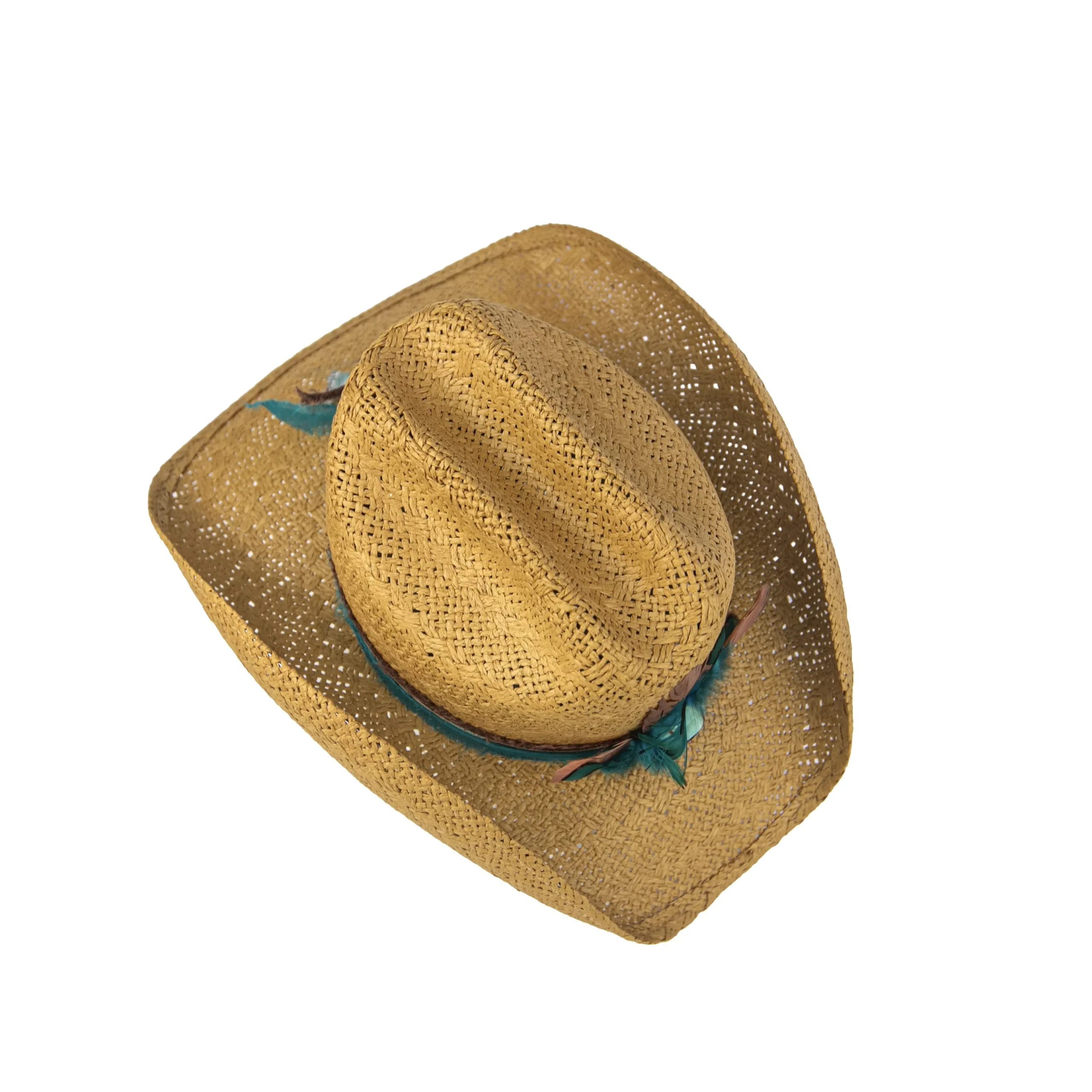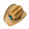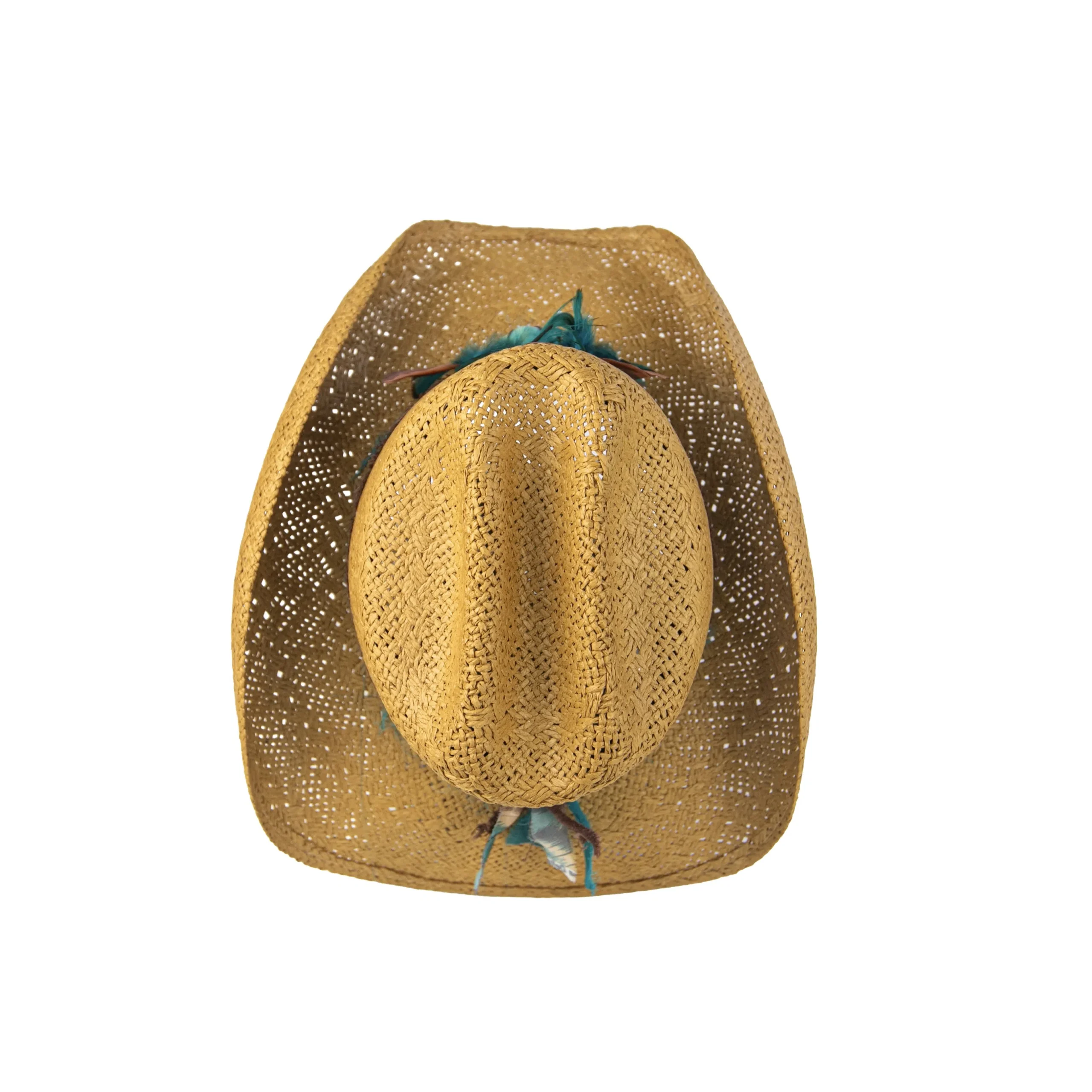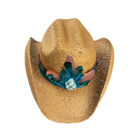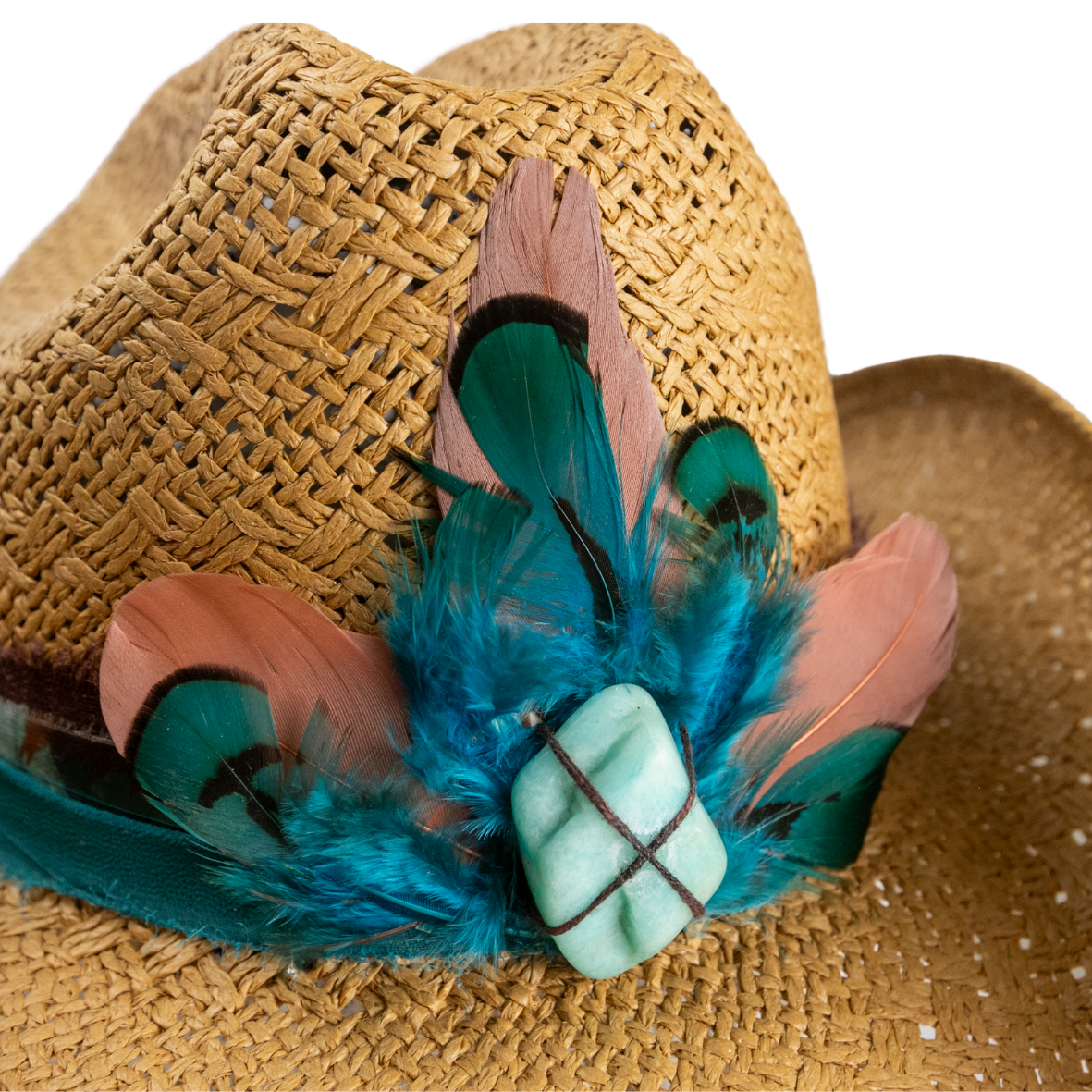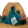 • Chapéu em palha dourada com aplicação de penas naturais em tons de azul e terracota, pedra central turquesa e faixa com estampa boho chic.