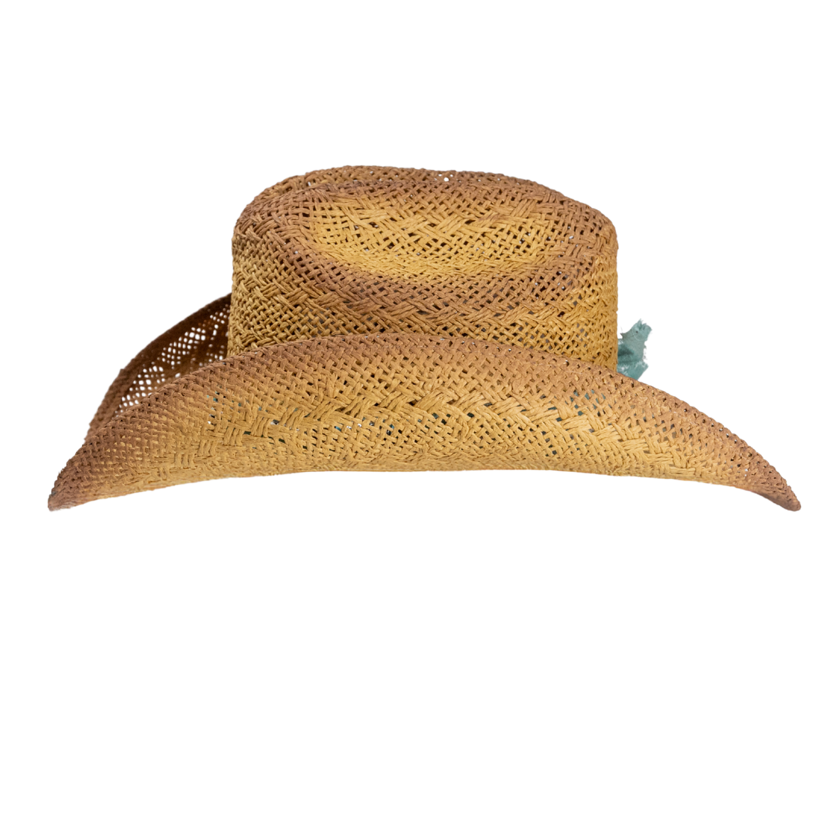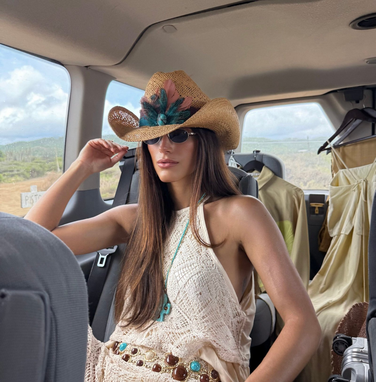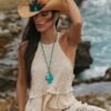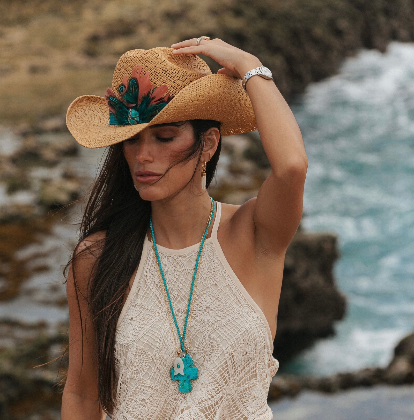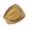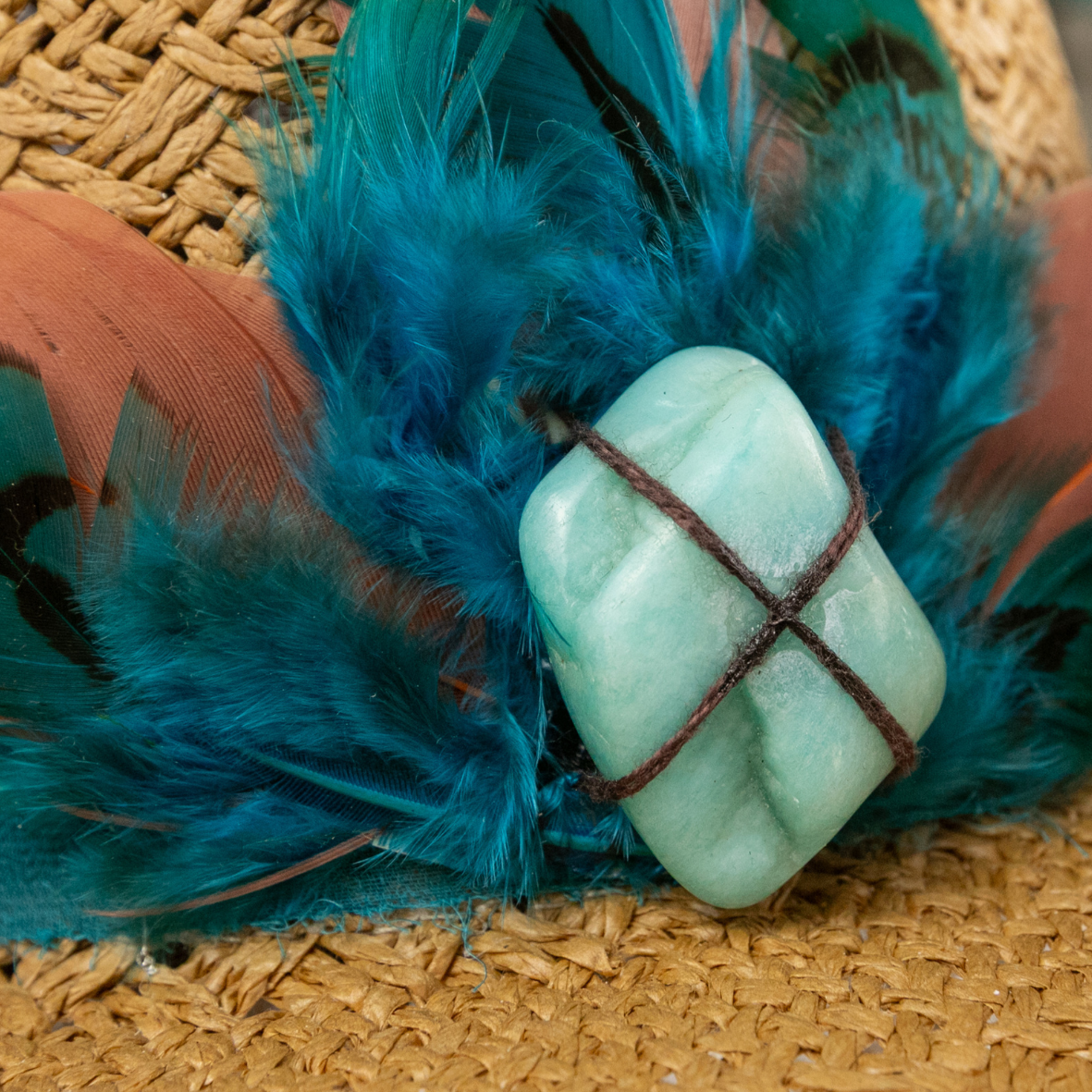 • Chapéu em palha dourada com aplicação de penas naturais em tons de azul e terracota, pedra central turquesa e faixa com estampa boho chic.