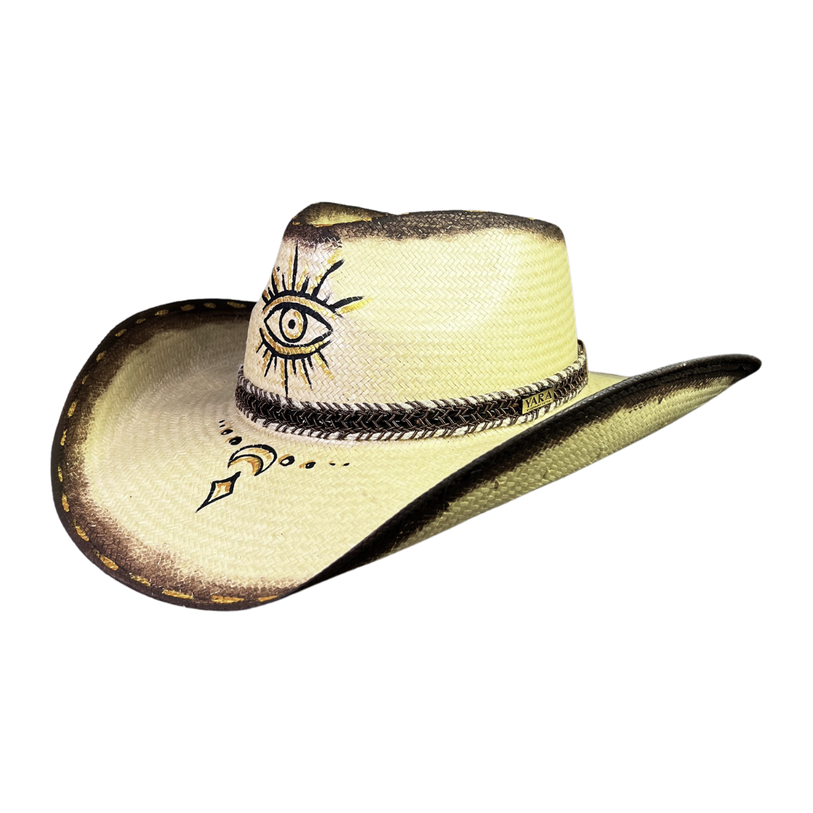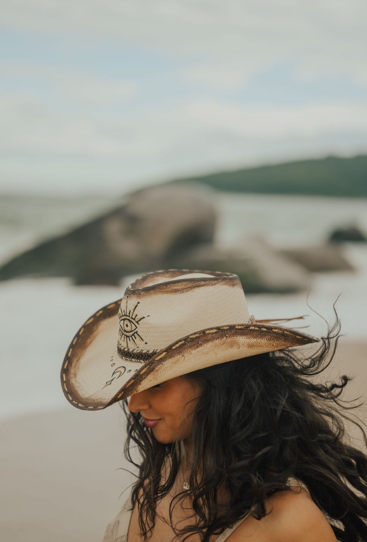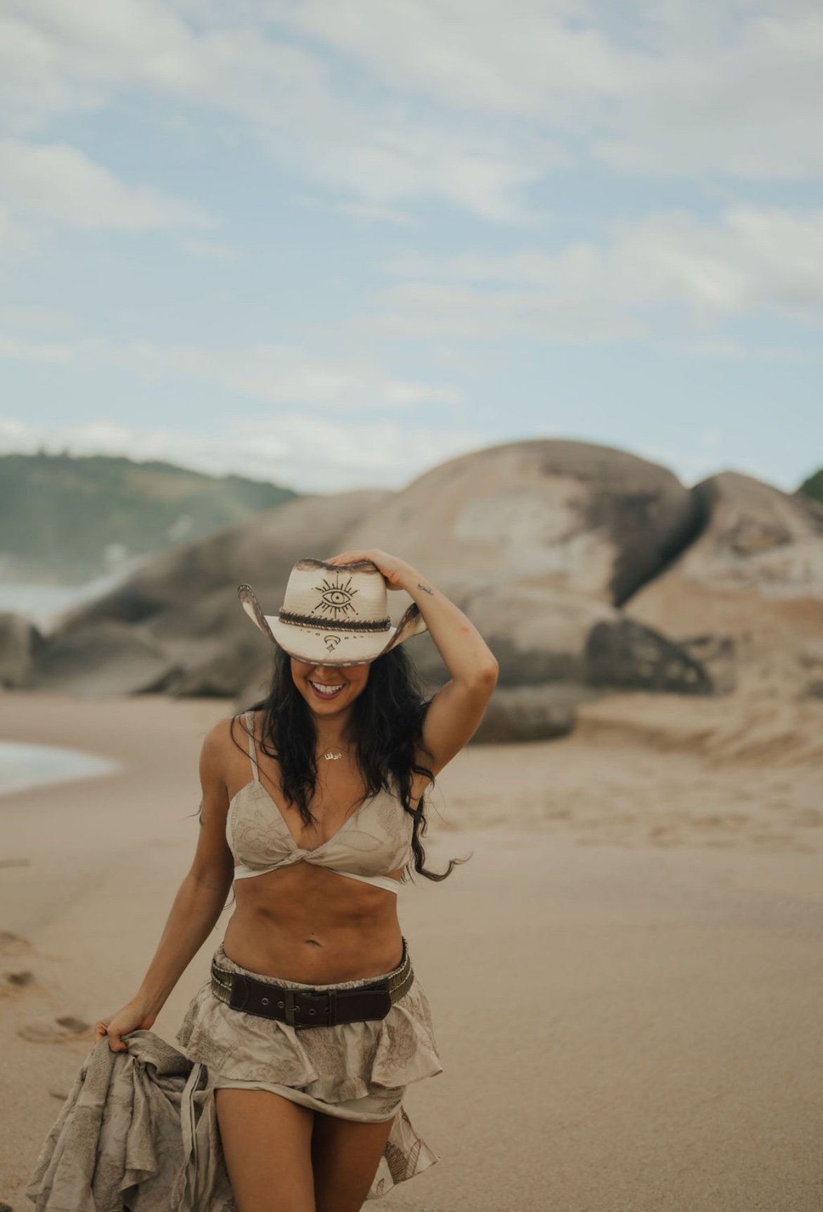 Khepri é um amuleto solar. Inspirado na mitologia egípcia, onde Khepri representa o nascer do sol, a renovação e o poder do invisível que se move, este YARA Hat é uma ode à transformação e à presença. Pintado à mão com símbolos de proteção e despertar, ele foi criado para espíritos que se movem com arte, intuição e liberdade.