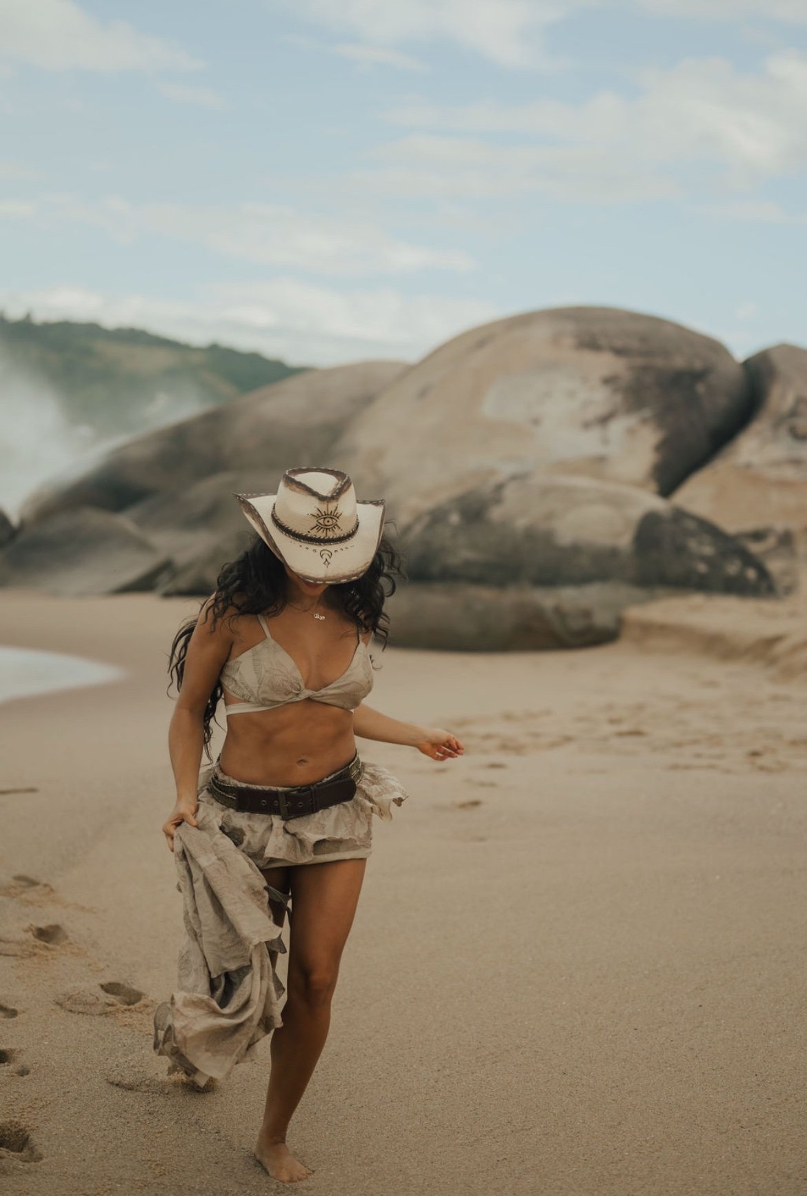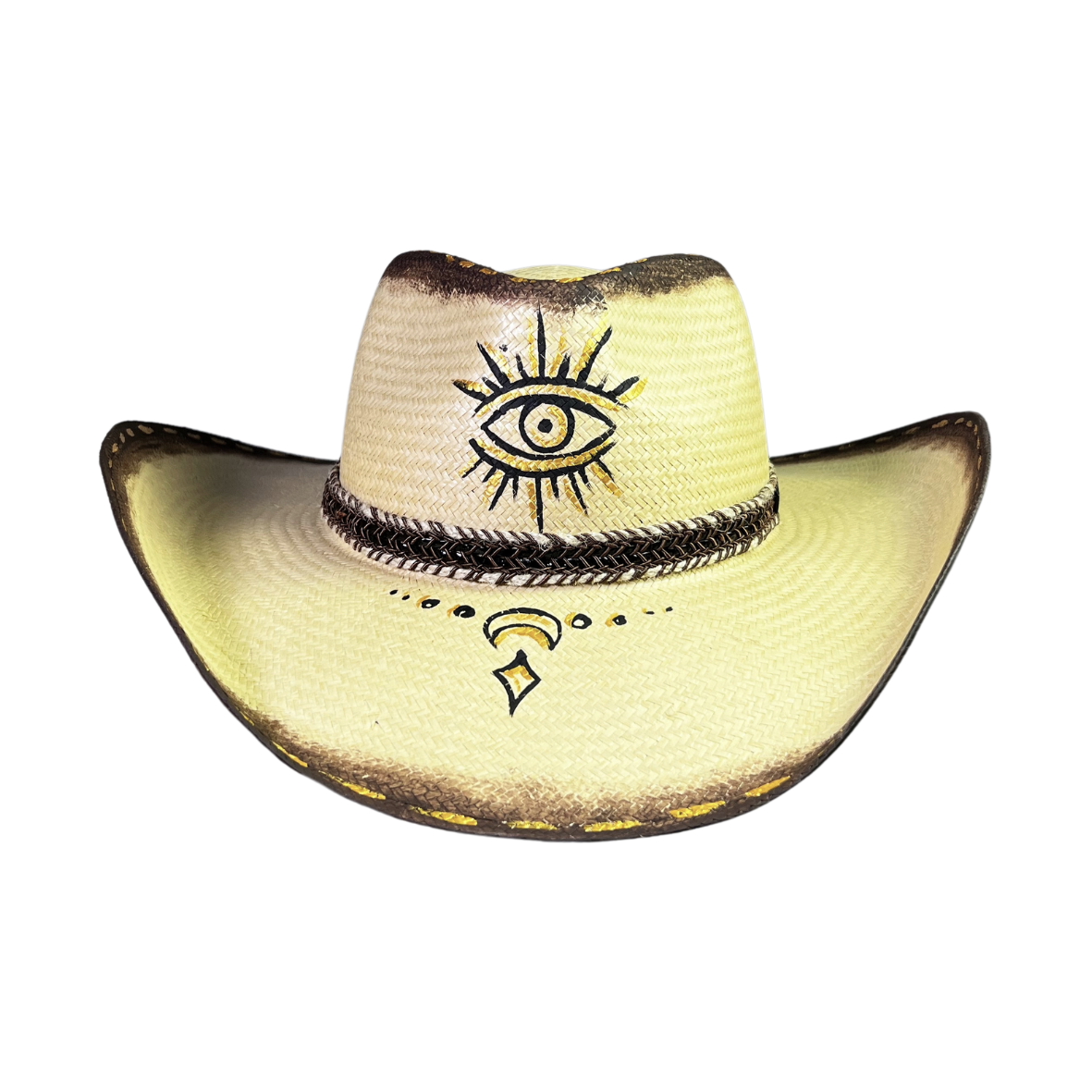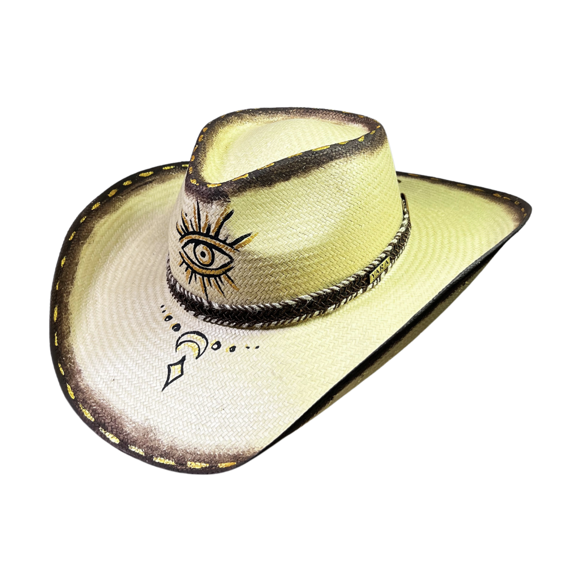 Khepri é um amuleto solar. Inspirado na mitologia egípcia, onde Khepri representa o nascer do sol, a renovação e o poder do invisível que se move, este YARA Hat é uma ode à transformação e à presença. Pintado à mão com símbolos de proteção e despertar, ele foi criado para espíritos que se movem com arte, intuição e liberdade.