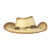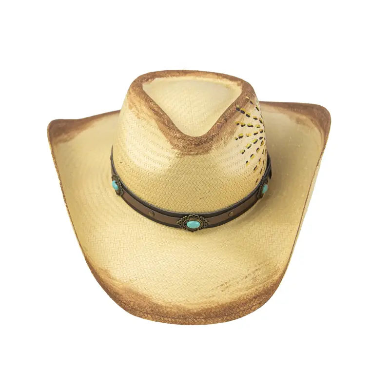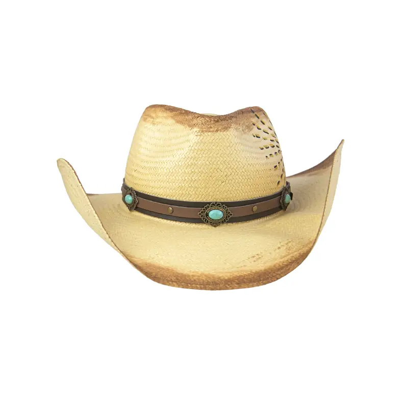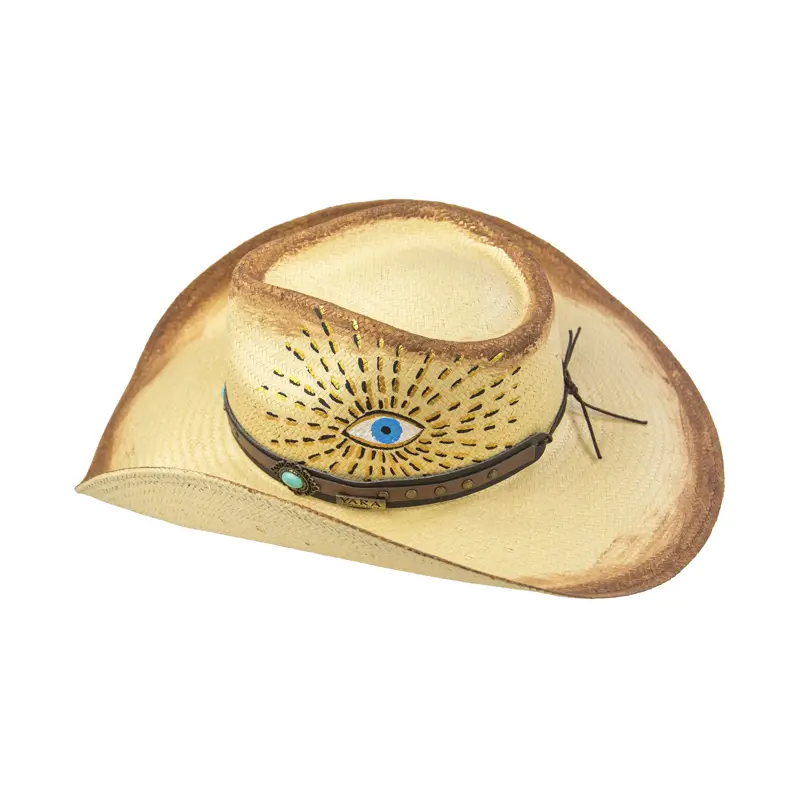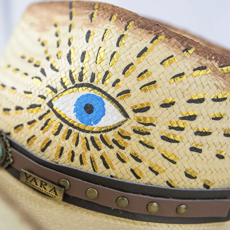 Feito com um trabalho de horas em pintura, este chapéu é confeccionado na melhor palha que existe, a Panamá legítima. Ele é adornado com uma bandana de couro e uma pedra azul turquesa, elementos que trazem um toque especial. Para finalizar, o design original do melhor amuleto que você pode carregar: o olho grego.