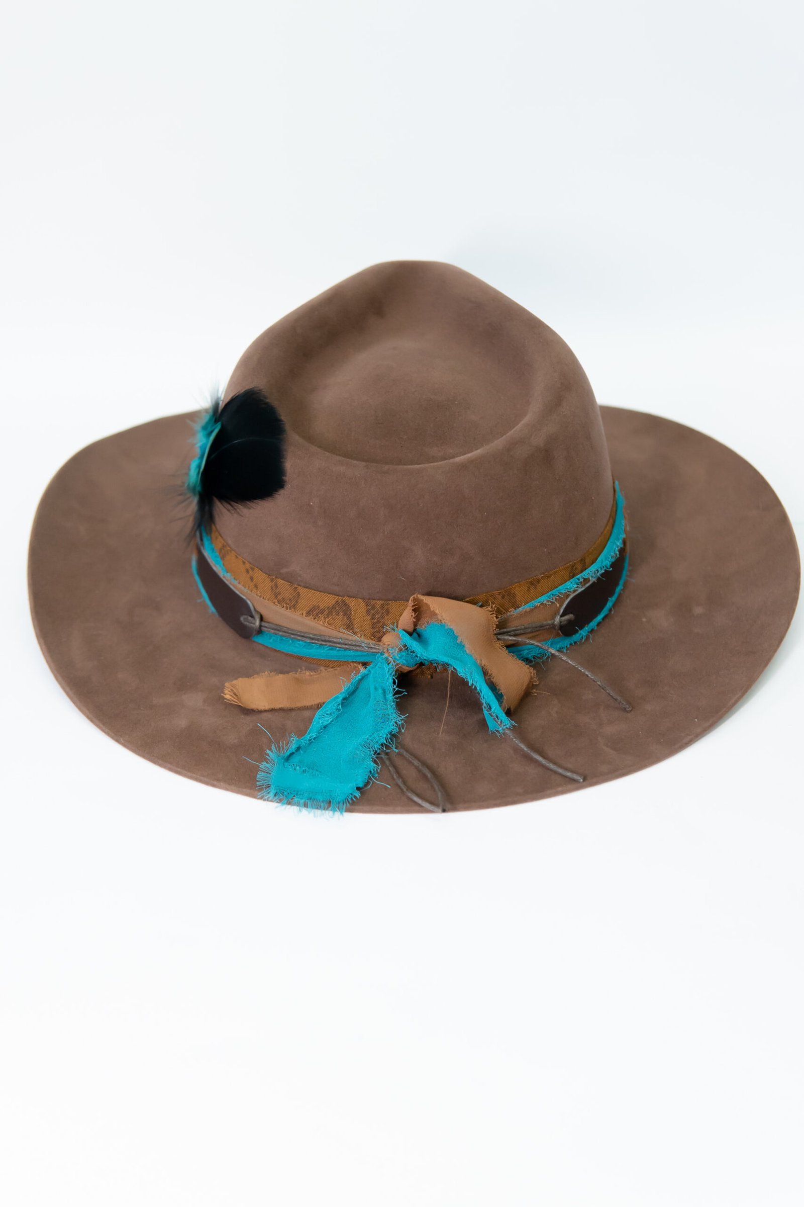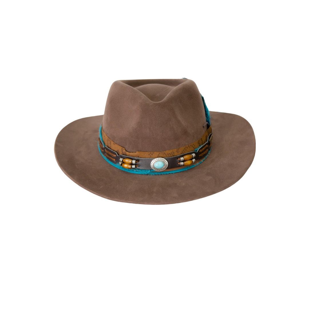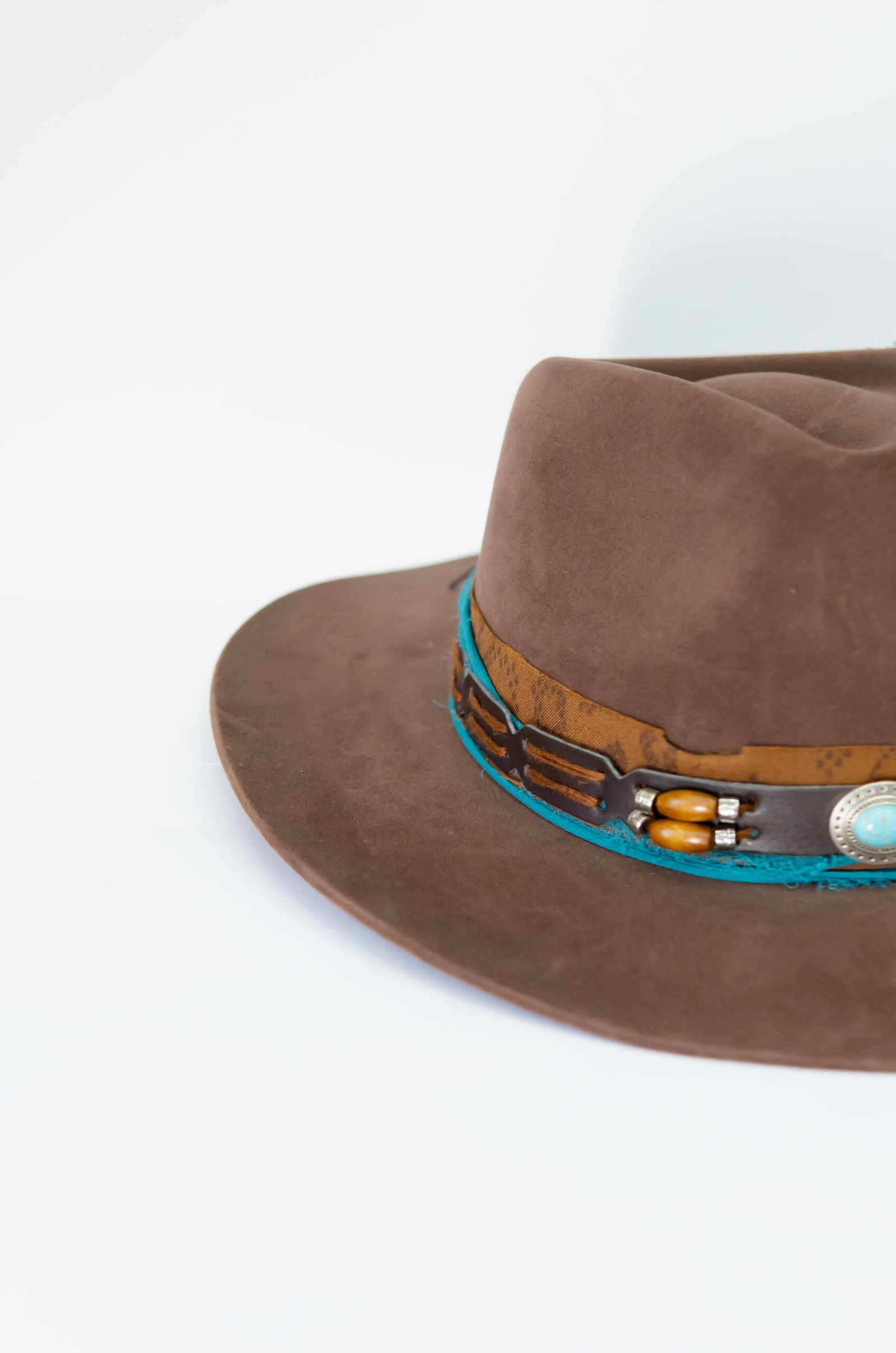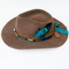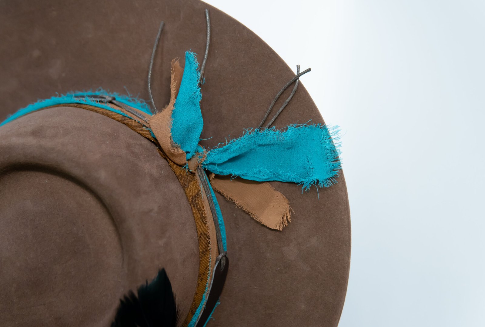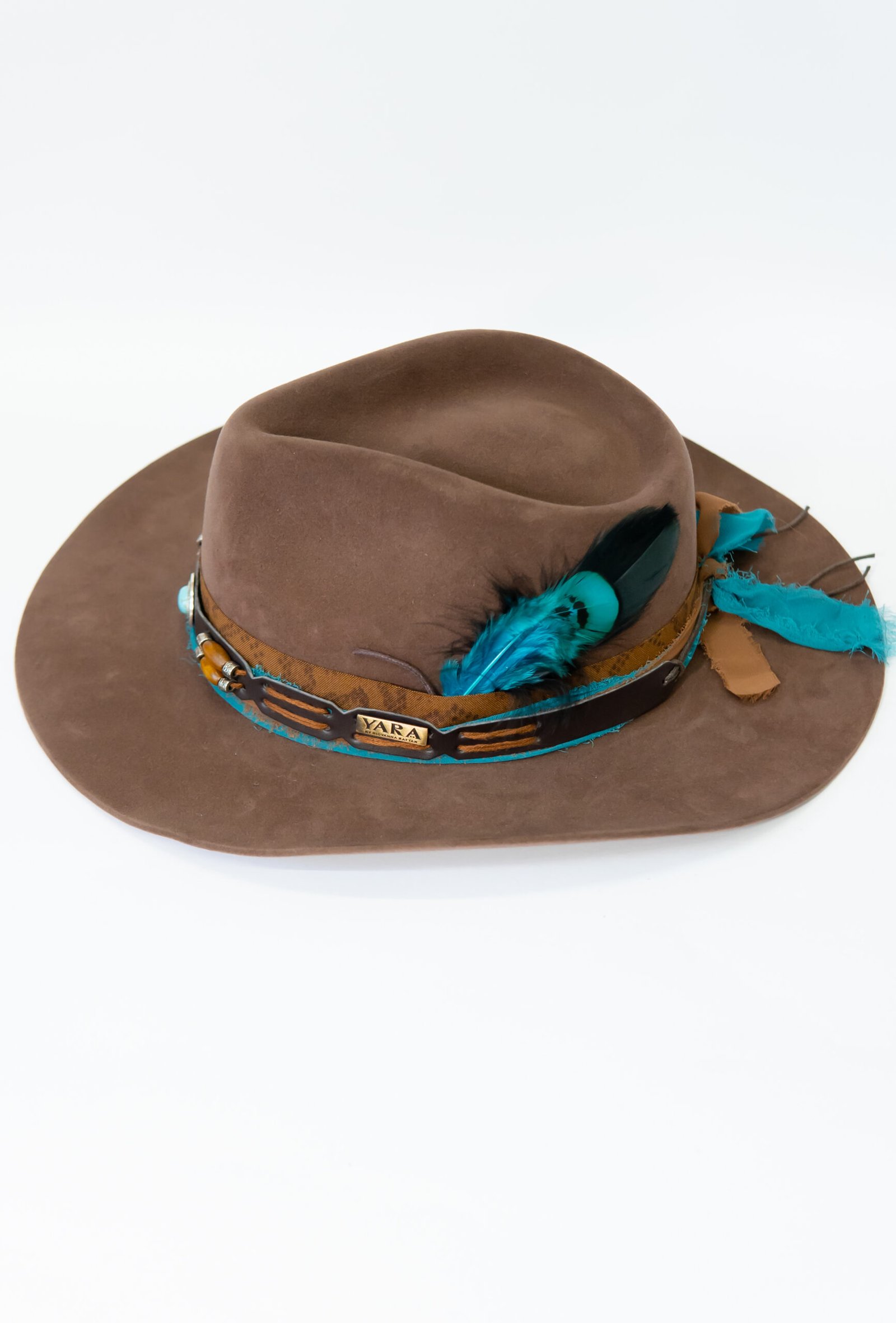 O chapéu é confeccionado em suede na cor Sahara, que remete às areias do deserto. A bandana em tecido oxford apresenta uma estampa de cobra marrom, adicionando um toque de ousadia e sofisticação. O tecido musseline em toque de seda confere um acabamento leve e delicado. O bottom em prata é destacado por detalhes na cor turquesa e contas de madeira, que trazem um elemento natural e aconchegante. Para finalizar, as penas naturais de faisão acrescentam movimento e uma conexão com a natureza.