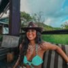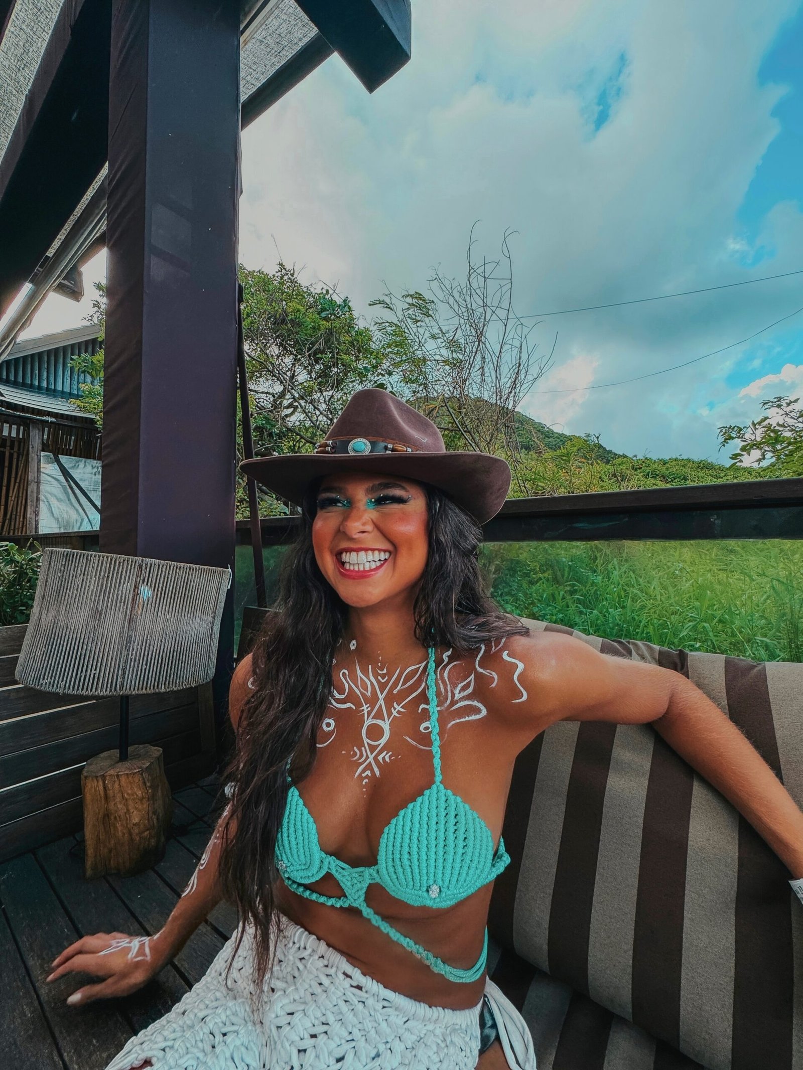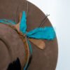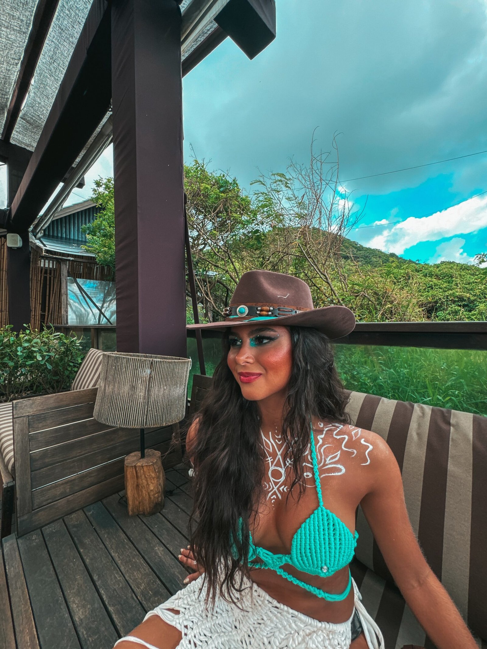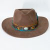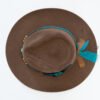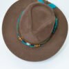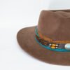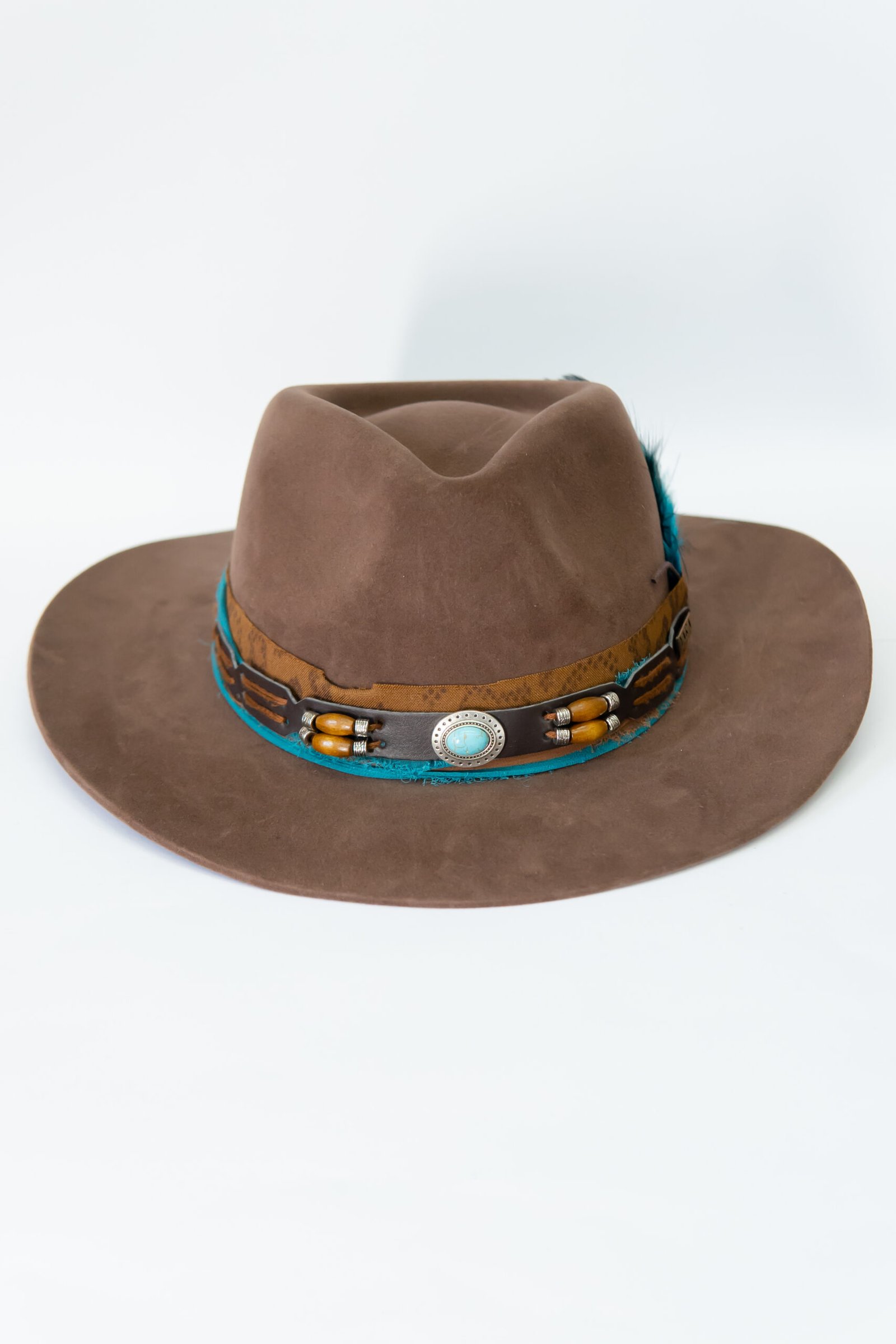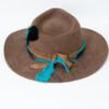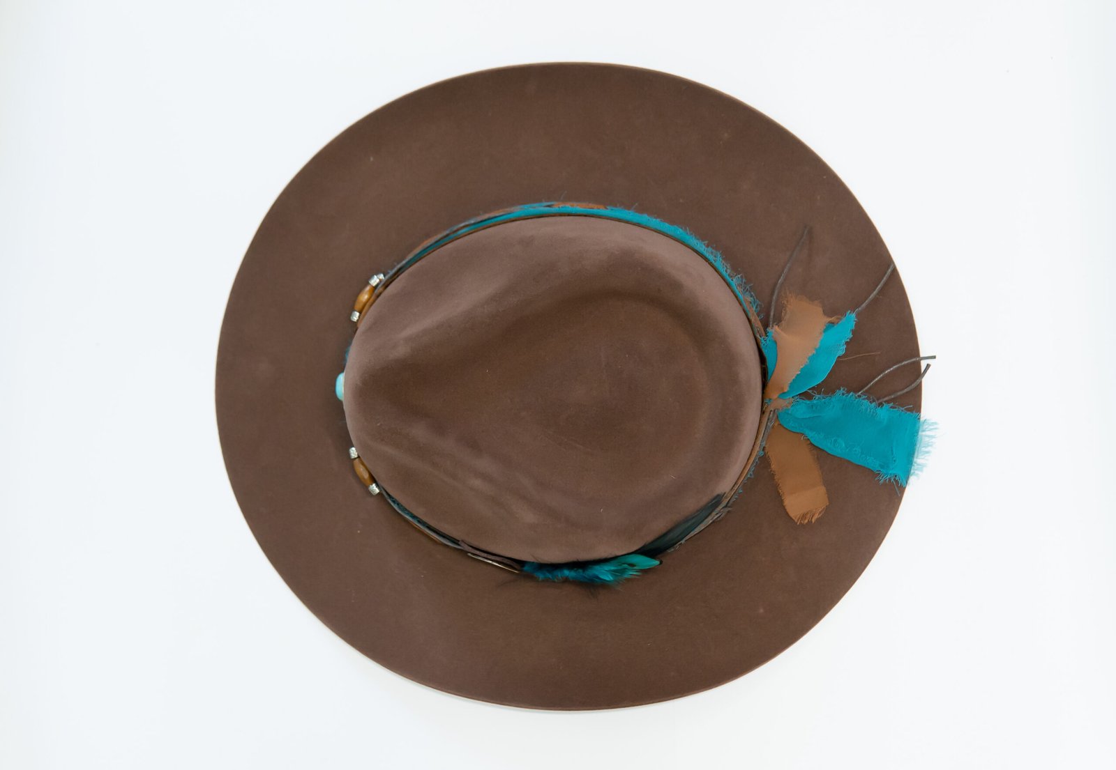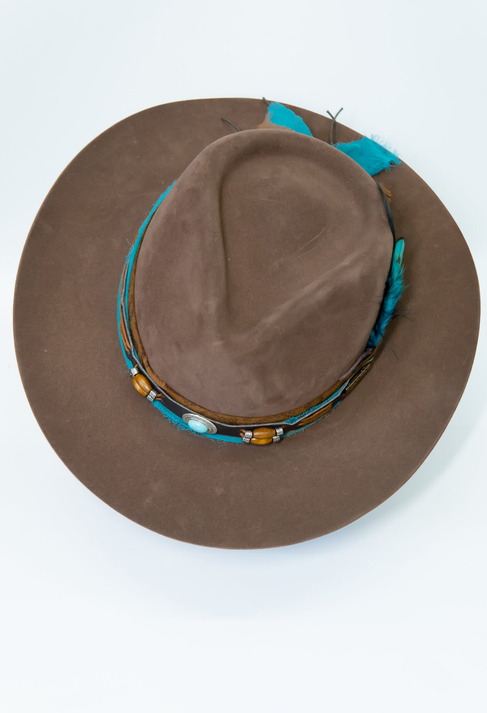 O chapéu é confeccionado em suede na cor Sahara, que remete às areias do deserto. A bandana em tecido oxford apresenta uma estampa de cobra marrom, adicionando um toque de ousadia e sofisticação. O tecido musseline em toque de seda confere um acabamento leve e delicado. O bottom em prata é destacado por detalhes na cor turquesa e contas de madeira, que trazem um elemento natural e aconchegante. Para finalizar, as penas naturais de faisão acrescentam movimento e uma conexão com a natureza.