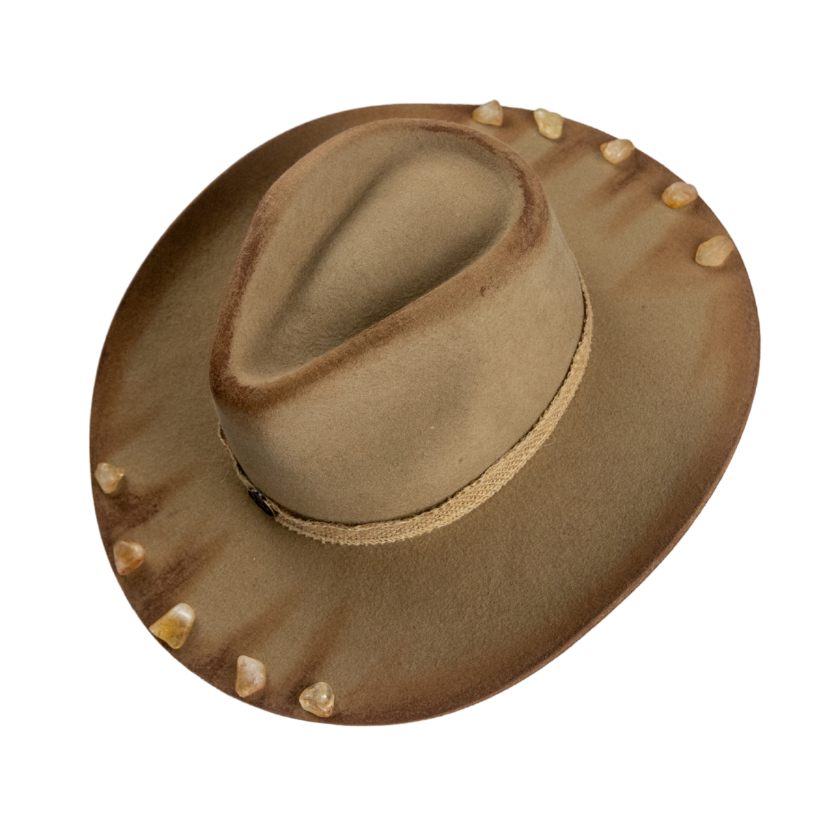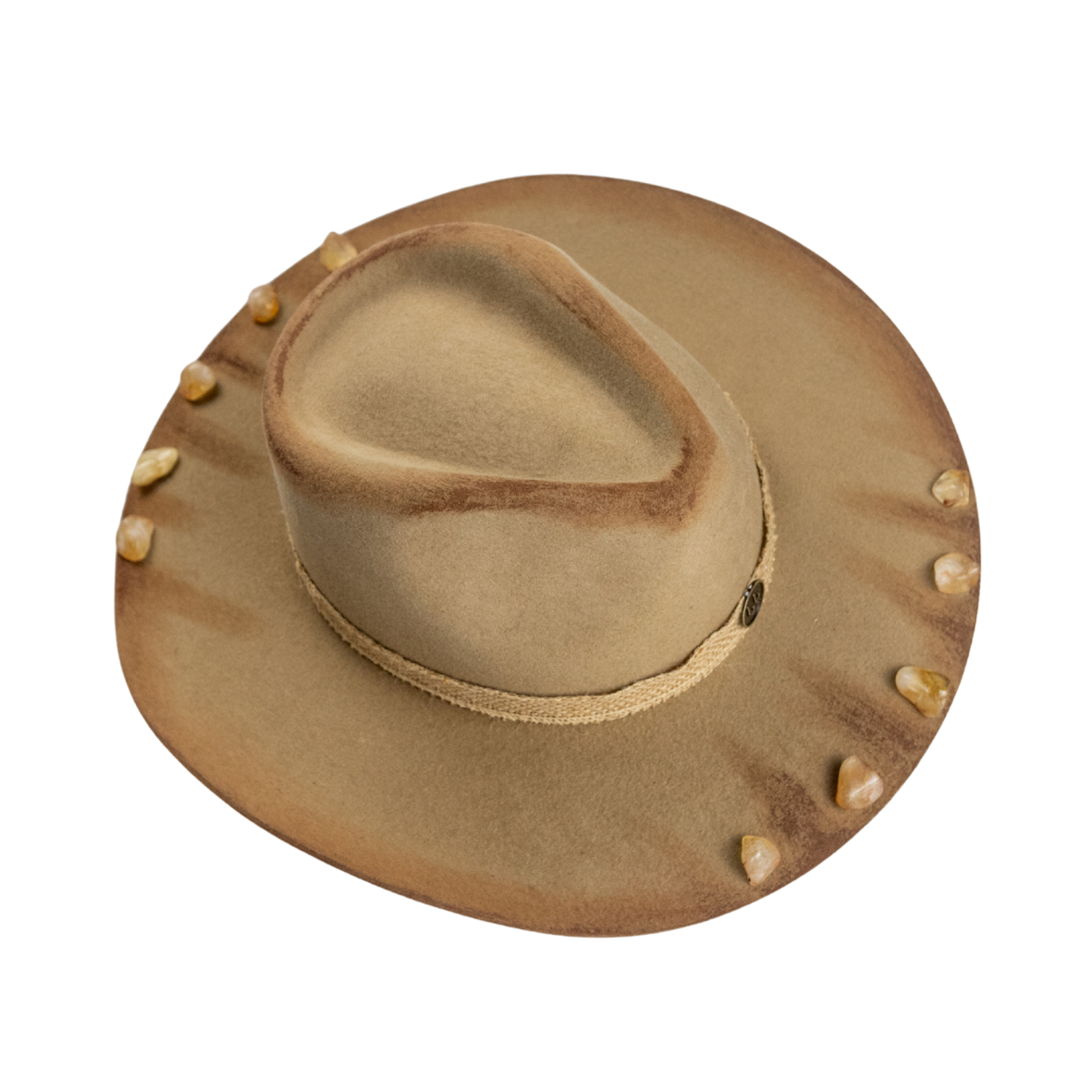 • Cristais de citrino aplicados à mão sobre acabamento queimado em maçarico.