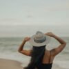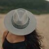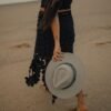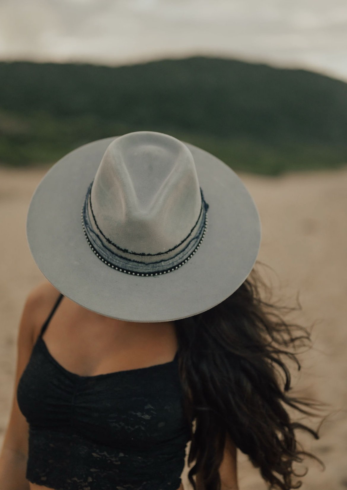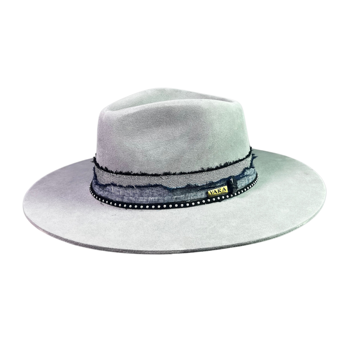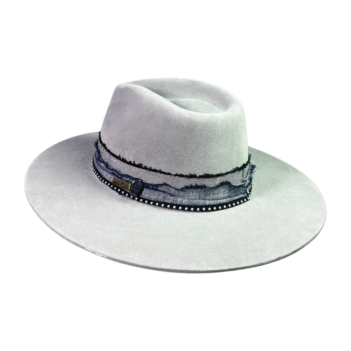 •Modelo fedora em suede branco, pintado à mão em tons de cinza, criando um efeito de cimento queimado único.