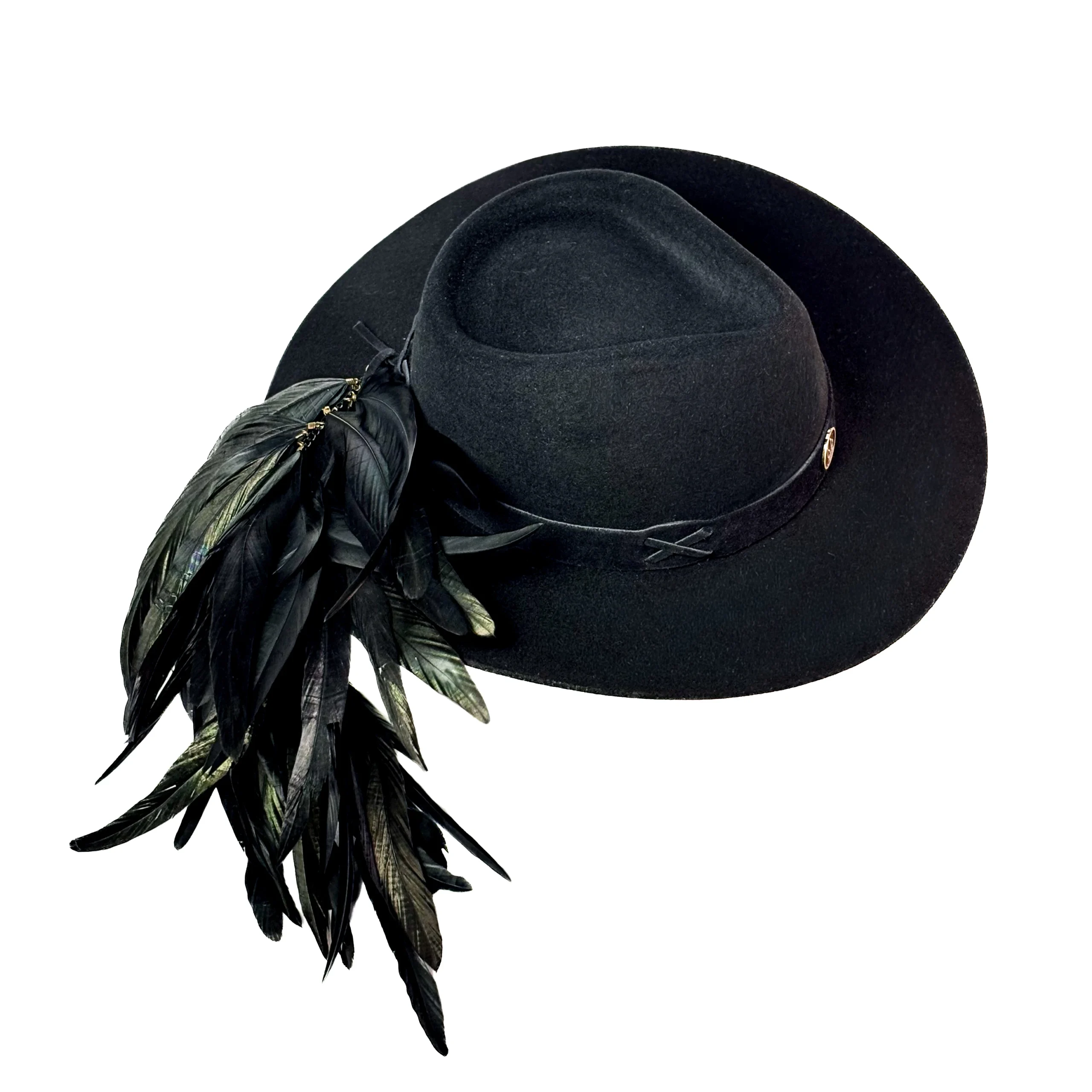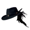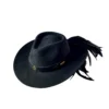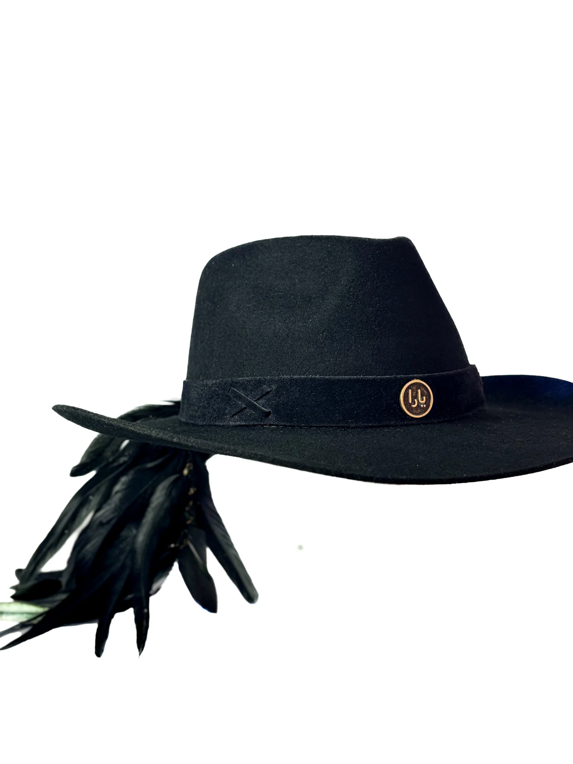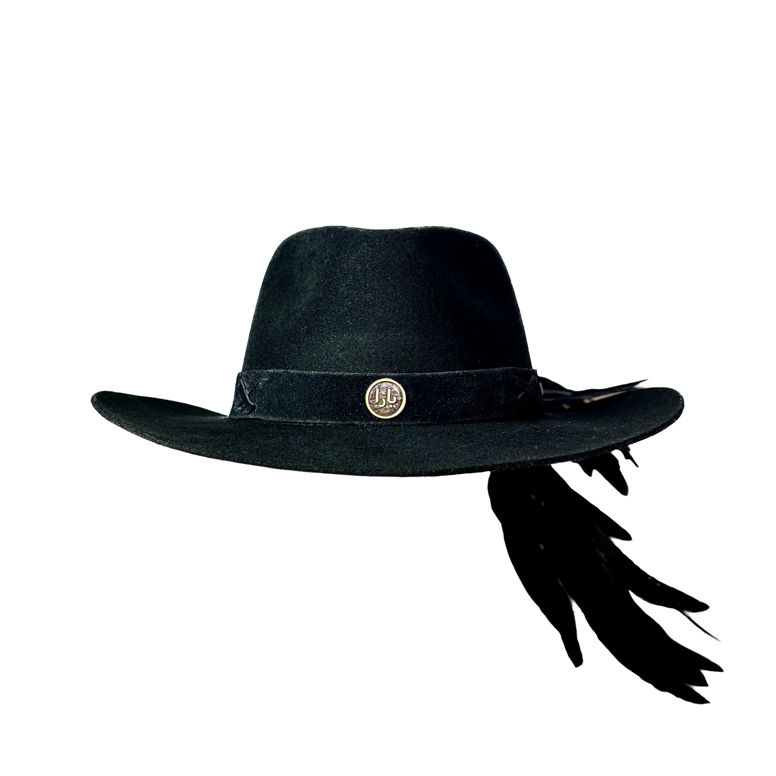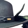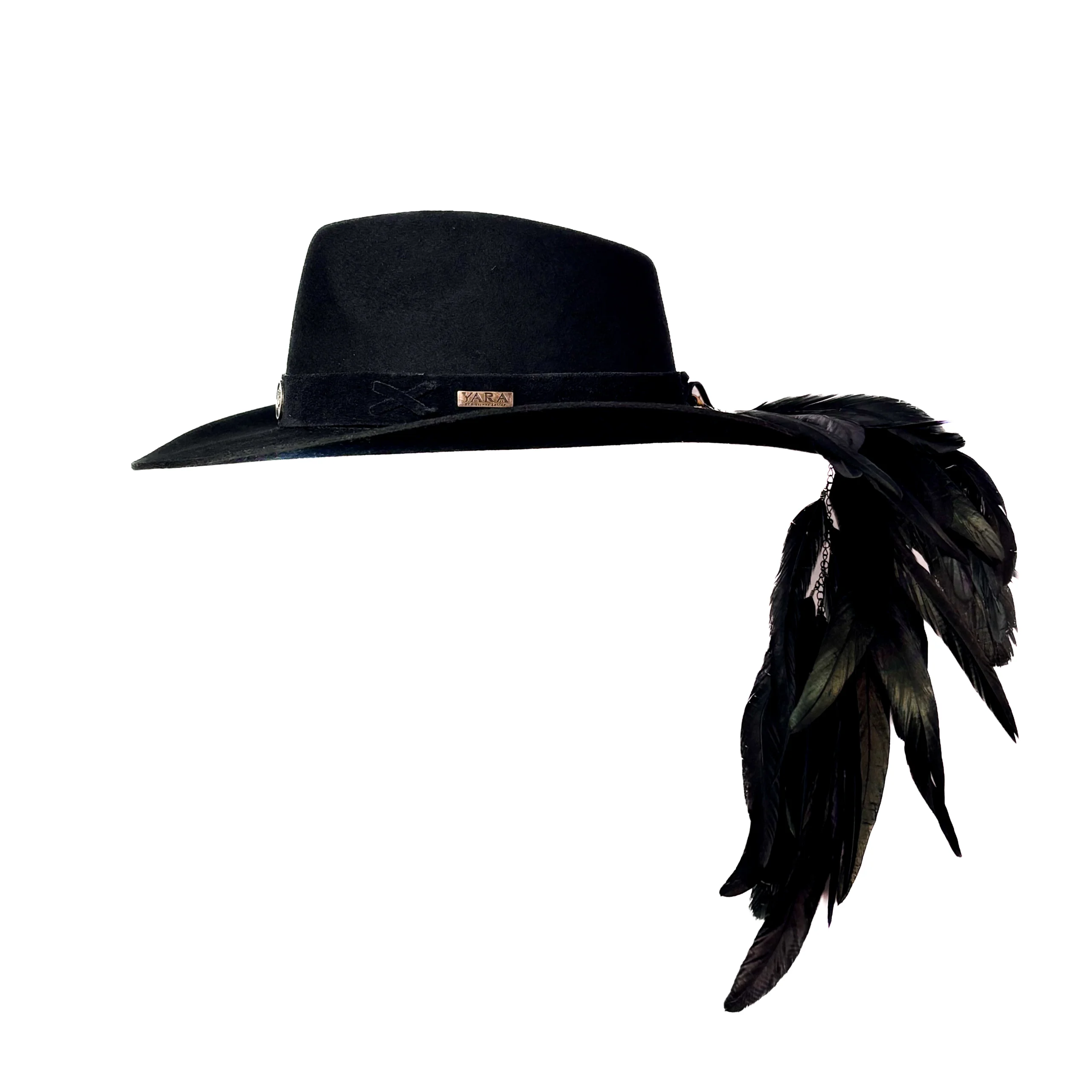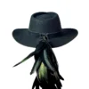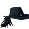 Feito 100% em lã, o chapéu é adornado com bordados especiais em fita de couro preta, além de mais de 20 penas naturais de faisão, que intensificam a conexão com a essência da natureza. O pingente e broche Yara adicionam um toque exclusivo à peça.