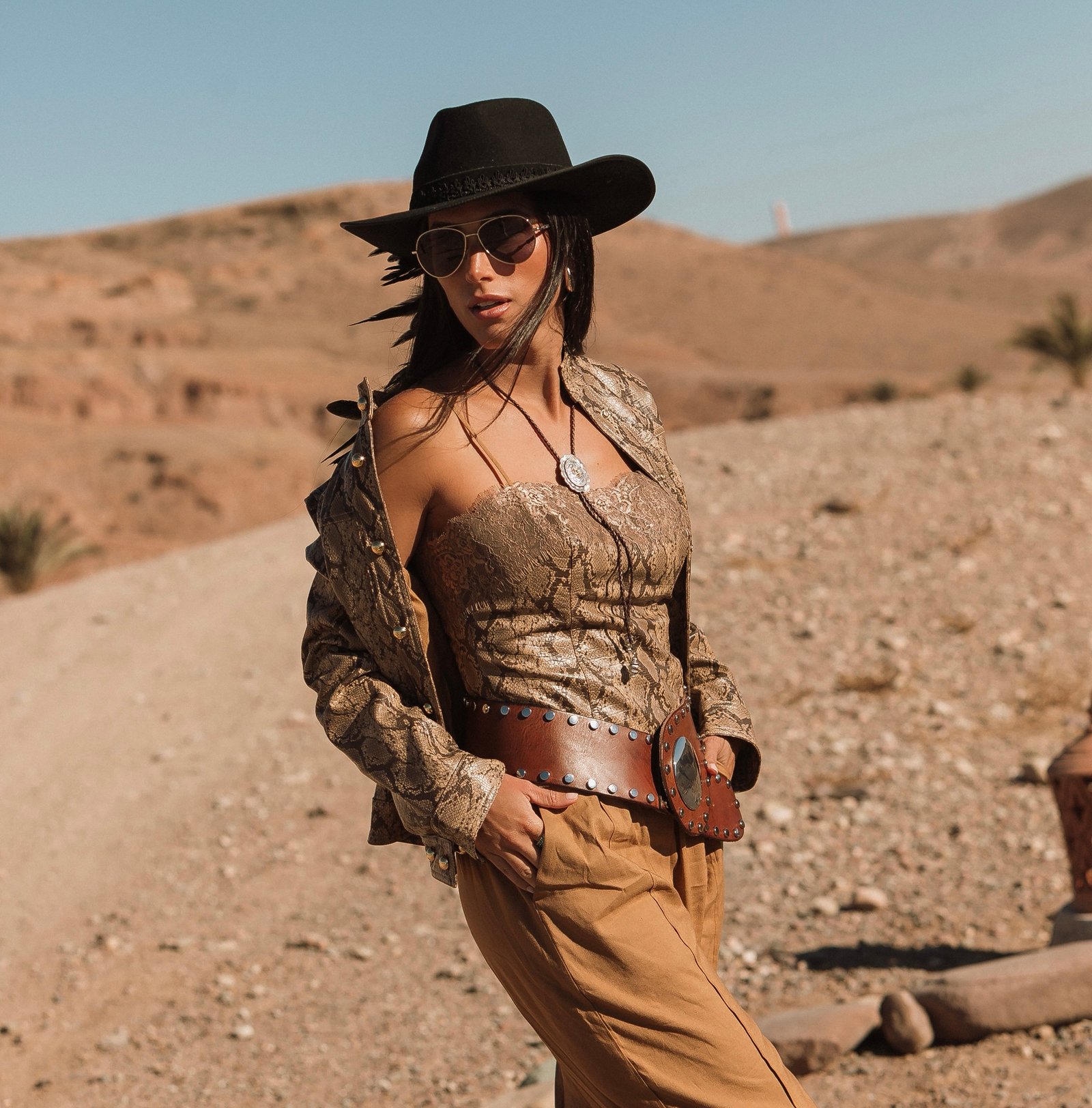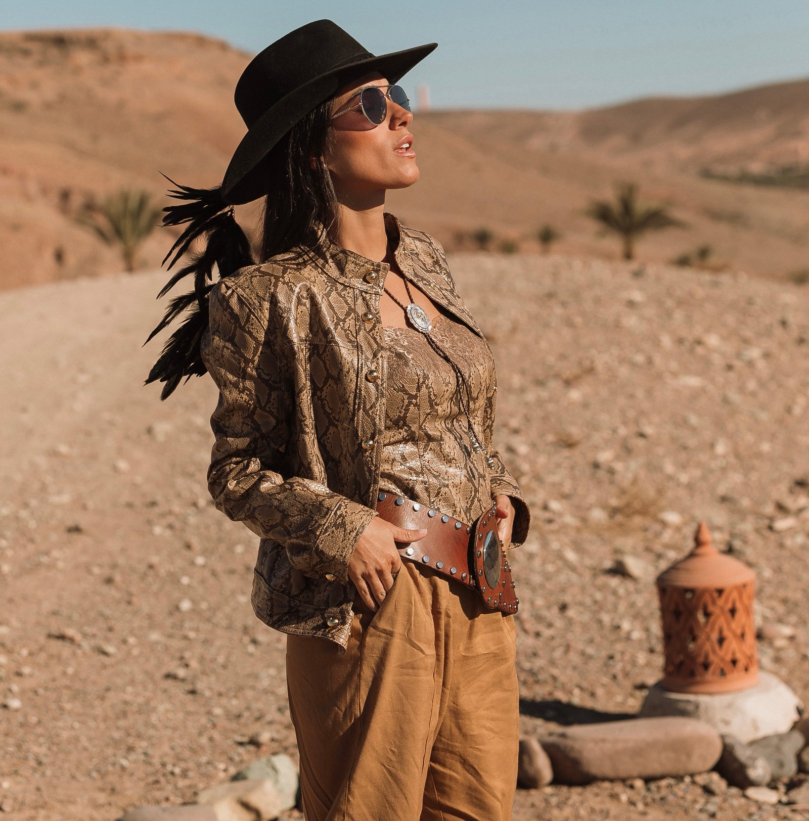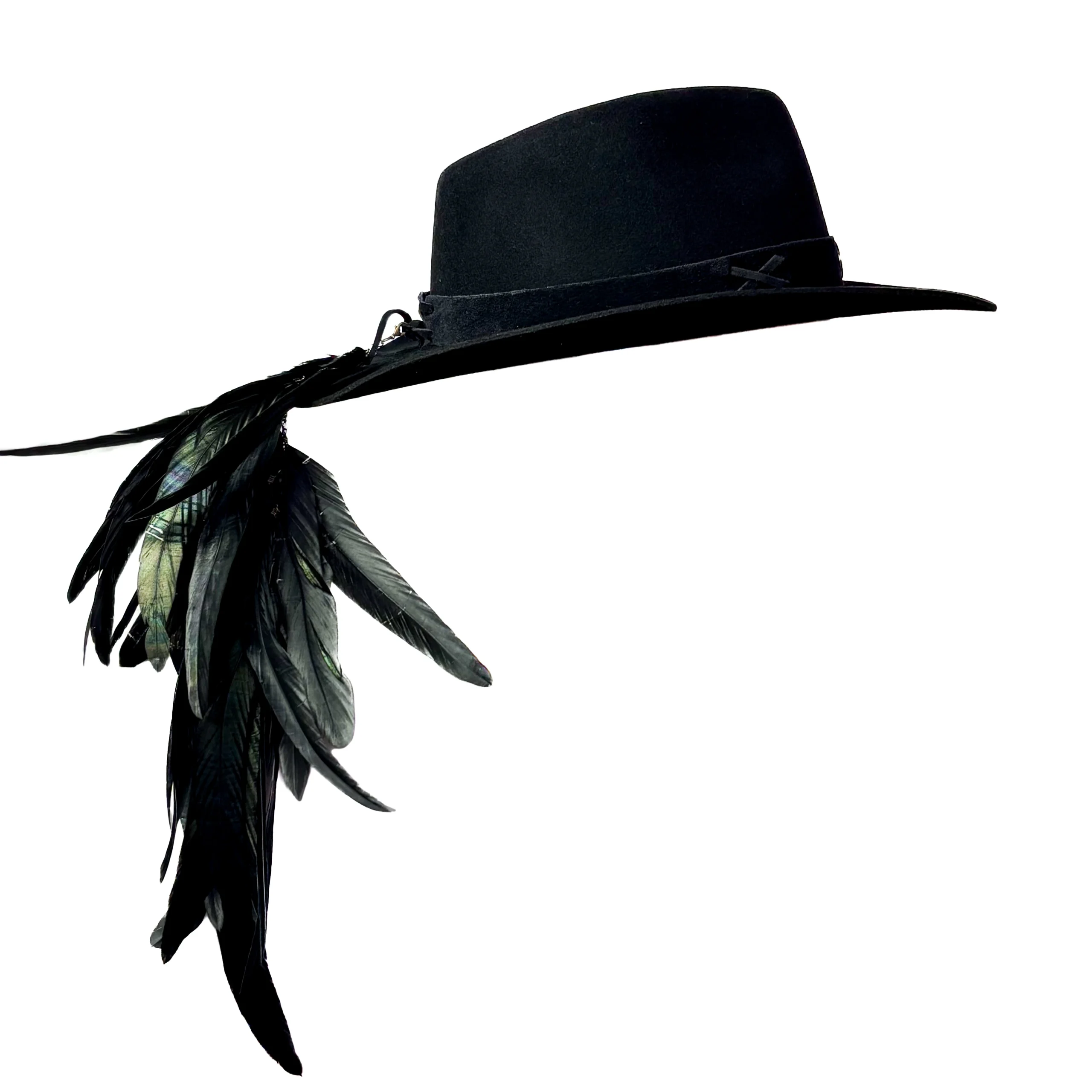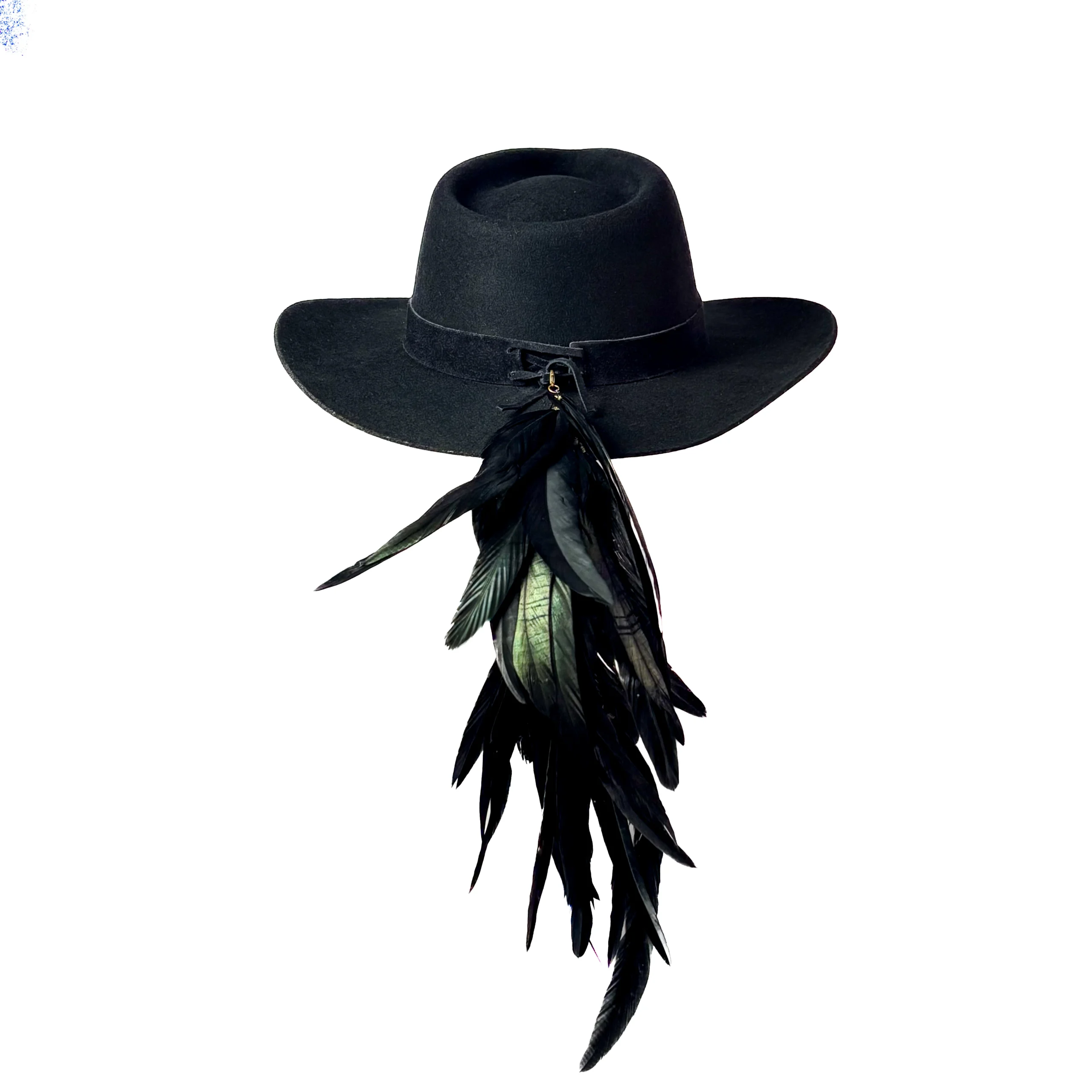Feito 100% em lã, o chapéu é adornado com bordados especiais em fita de couro preta, além de mais de 20 penas naturais de faisão, que intensificam a conexão com a essência da natureza. O pingente e broche Yara adicionam um toque exclusivo à peça.