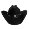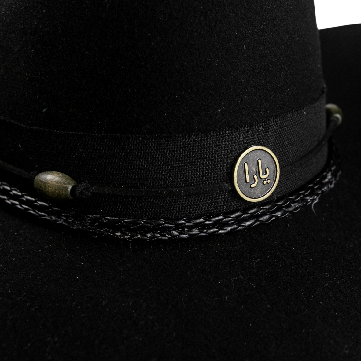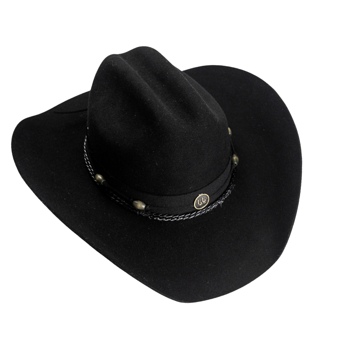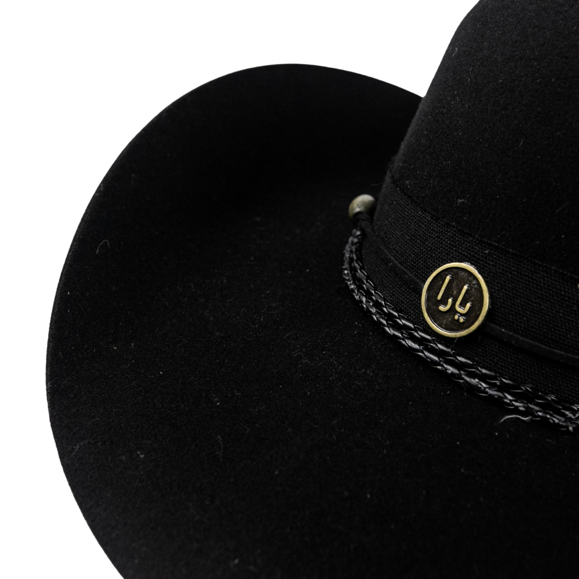 Aqui, ele ganha forma no feltro preto e no couro trançado, como um talismã country para aqueles que cruzam fronteiras com alma firme e olhar atento.
