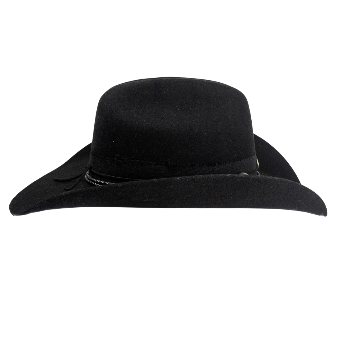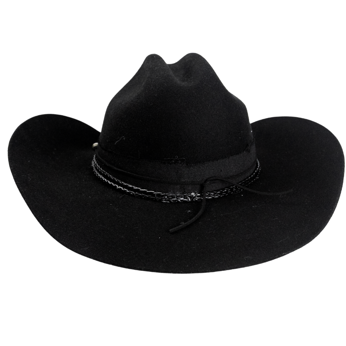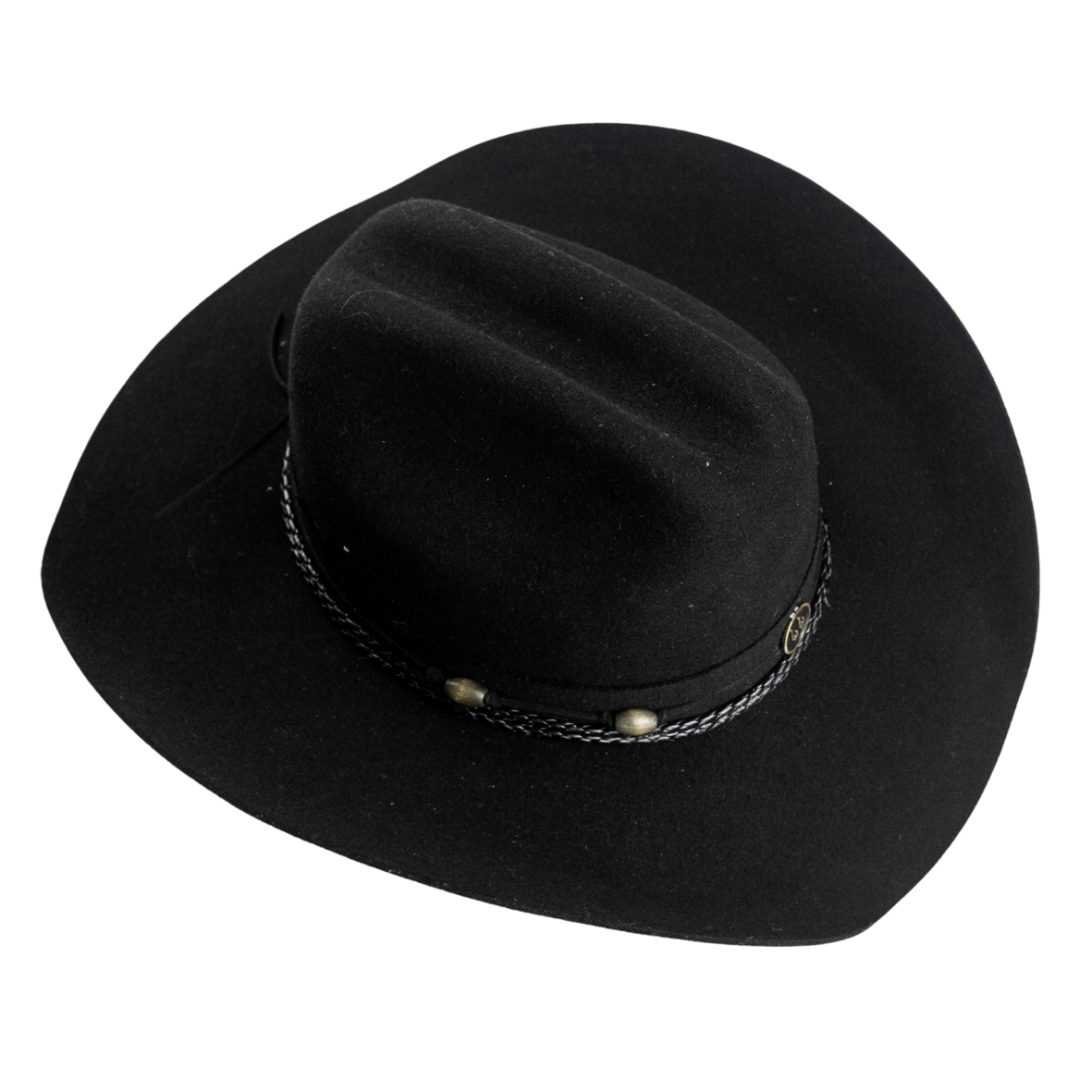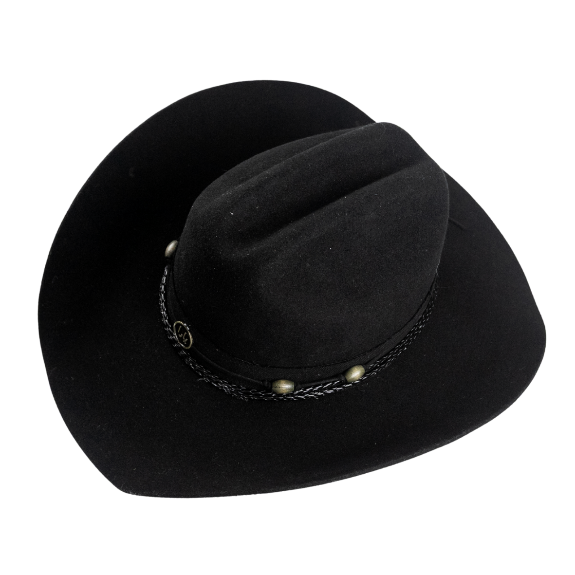 Aqui, ele ganha forma no feltro preto e no couro trançado, como um talismã country para aqueles que cruzam fronteiras com alma firme e olhar atento.